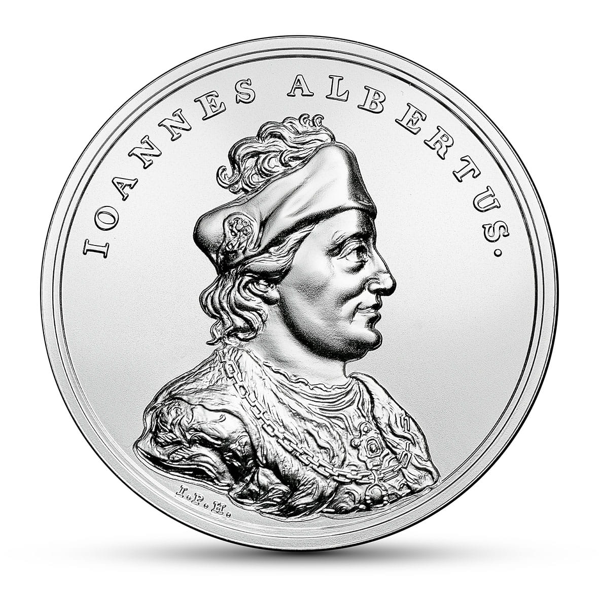 Dziesiąta moneta serii ukazuje Jana Olbrachta, trzeciego syna Kazimierza Jagiellończyka, króla Polski od 1492 r., księcia głogowskiego do 1498 r., nieskutecznie obranego królem węgierskim w 1490 r. Jego krótkie panowanie było trudne, obciążone klęską bukowińską. Na ten czas została zerwana unia personalna polsko-litewska (tron wielkoksiążęcy na Litwie objął jego brat Aleksander). Na medalowym popiersiu króla, w profilu zwróconym w prawo (według portretu pędzla Marcella Bacciarellego), widać podobieństwo rysów twarzy do rzeźby gotycko-renesansowego nagrobka w katedrze na Wawelu. Na medalu król nosi kołpak ze strusim piórem, na płaszczu zawieszony złoty łańcuch z medalionem. Na awersie monety czytamy, nieznacznie skrócony, tekst przeniesiony z rewersu medalu (w tłumaczeniu): Kazimierza syn trzeci, brat Władysława, króla Węgier i Czech, a także Świętego Kazimierza, zwycięzca Tatarów, pokonany w bitwie z Wołochami. Umarł w Toruniu Roku Pańskiego 1501, mając lat 41, w 9. roku panowania, dnia 7 sierpnia. Jan Olbracht, urodzony w 1459 r., był trzecim synem Kazimierza Jagiellończyka i Elżbiety Rakuszanki. Przyłączył księstwa zatorskie i płockie do Korony. W polityce zagranicznej skupił się na walce z Tatarami i Turkami, a także dążeniu do odzyskania polskiej zwierzchności nad Mołdawią i Wołoszczyzną, lenn Polski od 1387 r. Wyprawa pospolitego ruszenia szlacheckiego w 1497 r. zakończyła się klęską w bitwie pod Koźminem na Bukowinie, gdzie zginęło około 5 tys. polskiej szlachty (mawiano „Za króla Olbrachta wyginęła szlachta”). Wojnę przerwał rozejm w 1501 r. W celu pozyskania podatków na obronność poszerzono szlachcie przywileje (1496 r., statuty piotrkowskie). Ważne zmiany zaszły w polskim parlamentaryzmie – dotychczasowa Rada Królewska przekształciła się w Senat, a zjazdy sejmików szlacheckich w Izbę Poselską Sejmu, co stworzyło podwaliny tzw. demokracji szlacheckiej. Jan Olbracht zmarł bezpotomnie, został pochowany na Wawelu, a jego serce złożono w bazylice św. Janów w Toruniu. Marta Męclewska
