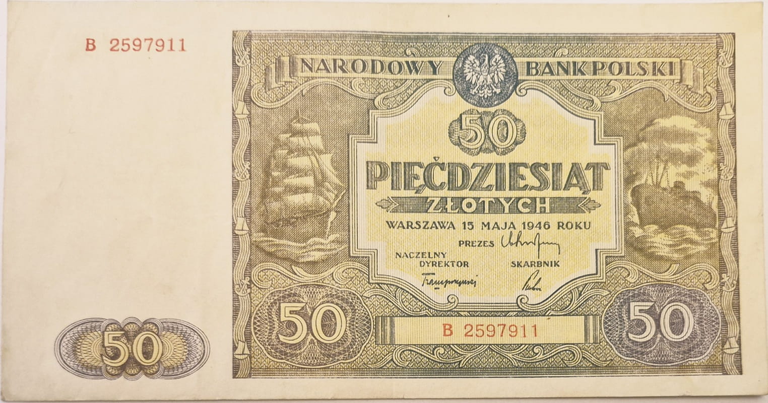 Banknot obiegowy PRL 50 złotych 1946 rok Polska Rzeczpospolita Ludowa, emitent Narodowy Bank Polski NBP, producent PWPW w Warszawie, materiał papier, wymiary banknotu 164 mm x 87 mm, stan zachowania -2, real foto
