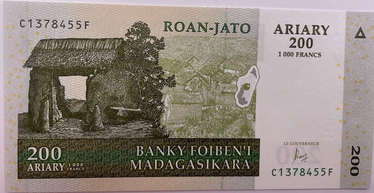 Awers: Na awersie banknotu stylizowane zabudowa wioski. W lewym dolnym rogu nominał banknotu 200 Ariary oraz u góry po prawej stronie banknotu powtórzony jego nominał. U dołu banknotu w dwóch rzędach napis: BANKY FOIBEN'I / MADAGASIKARA (Centralny Bank Madagaskaru). W prawym górnym rogu kółko identyfikacji banknotu poprzez dotyk. W lewym górnym i prawym dolnym rogu seriabanknotu i jej numer