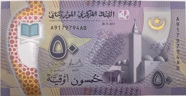 50 ouguyia 2020 r. - banknot 50 ouguyia Mauretania z kategorii obiegowe banknoty świata kontynent Afryka, materiał polimer stan zachowania UNC