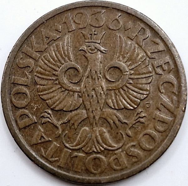 1 grosz 1936 r. - moneta obiegowa z okresu II Rzeczpospolitej Polskiej, metal brąz, emitent Bank Polski, producent Mennica Państwowa, stempel zwykły, stan zachowania ok. -2, real foto