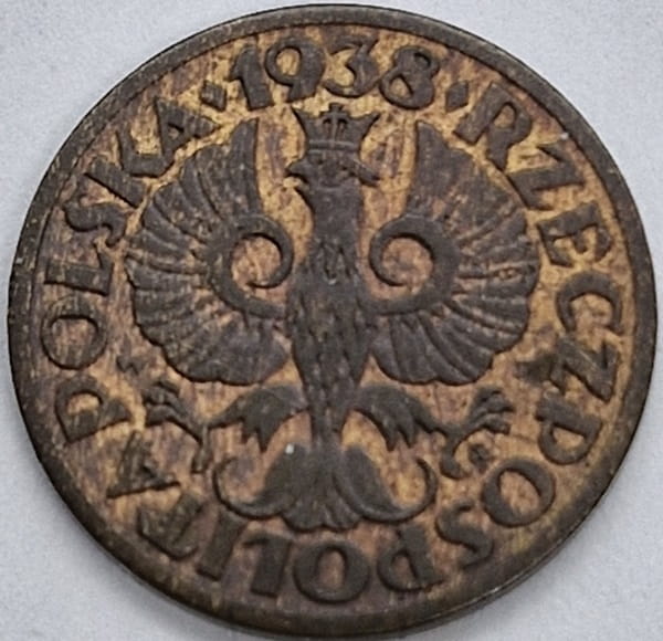 1 grosz 1938 r. - moneta obiegowa z okresu II Rzeczpospolitej Polskiej, metal brąz, emitent Bank Polski, producent Mennica Państwowa, stempel zwykły, stan zachowania 2 , real foto