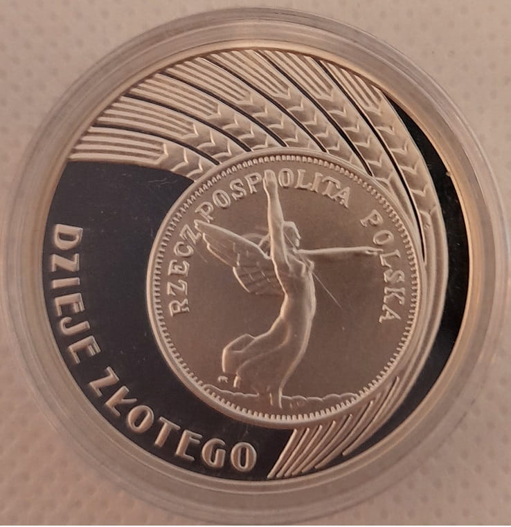 Na rewersie z prawej strony wzór rewersu monety 5 zł z 1928 r. z wizerunkiem skrzydlatej Nike. W tle stylizowane kłosy zboża. Z lewej strony półkolem dużymi literami napis: Dzieje złotego