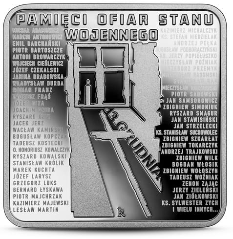 Na rewersie u góry napis w dwóch rzędach. PAMIĘCI OFIAR STANU / WOJENNEGO. Poniżej stylizowane okno, w nim zapalona świeczka, poniżej stylizowany krzyż i napis 13 GRUDNIA. Po prawej oraz po lewej stronie monety lista 56 nazwisk ofiar stanu wojennego.
