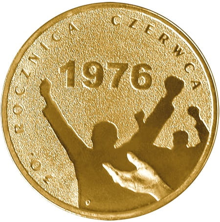 Na rewersie w jej centrum widnieje stylizowany wizerunek sylwetek mężczyzn z uniesionymi rękoma w górze. Z prawej strony u dołu monety stylizowany wizerunek otwartej dłoni. Nad sylwetkami rok 1976. W otoku monety przy jej rancie napis dużymi literami: 30. rocznica Czerwca