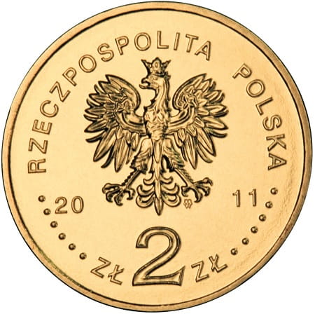 Na awersie wizerunek orła w koronie ustalony dla godła Rzeczypospolitej Polskiej. Po bokach orła rok emisji monety: 20-11. Pod orłem nominał monety w zapisie: ZŁ 2 ZŁ, w otoku przy rancie monety napis dużymi literami: Rzeczpospolita Polska poprzedzony oraz zakończony sześcioma perełkami. Pod lewą łapą orła znak mennicy: m/w