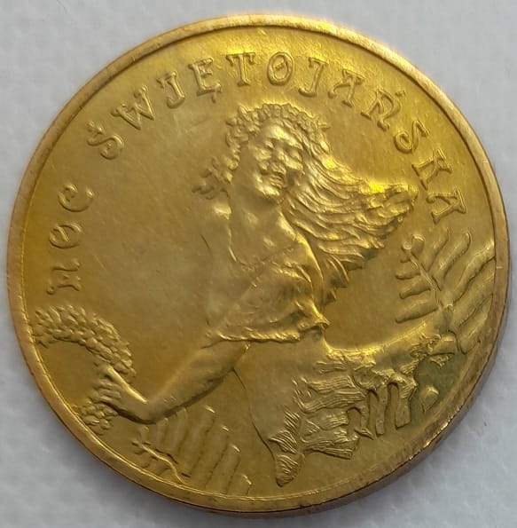 Na rewersie wizerunek tańczącej dziewczyny trzymającej w dłoni wianek z kwiatów. U dołu stylizowane liście paproci. U góry półkolem napis: NOC ŚWIĘTOJAŃSKA.