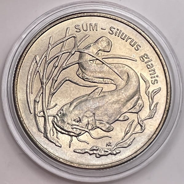 Sum łac. Silurus glanis, moneta okolicznościowa miedzionikiel z kategorii monety 2 złote emitent NBP, producent Mennica Polska S.A., z serii Zwierzęta Świata, 2 z serii 20 monet, stempel zwykły, stop miedzionikiel. Średnica monety 29,50 mm, masa 10,80 gram, nakład emisji 300 000 sztuk, rok emisji 1995, projektant Roussanka Nowakowska, moneta w kapslu ochronnym, stan zachowania menniczy