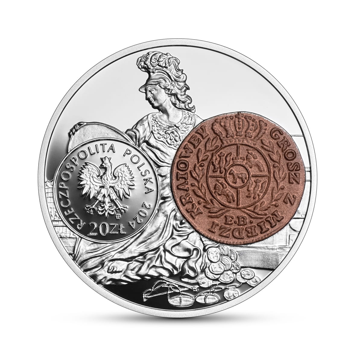 Z lewej strony, na wyodrębnionej płaszczyźnie w kształcie koła, wizerunek orła ustalony dla godła Rzeczypospolitej Polskiej, pod orłem, po prawej stronie, znak mennicy: m / w, w otoku napis: RZECZPOSPOLITA POLSKA 2024; u dołu napis: 20 ZŁ. W tle wizerunek rzymskiej bogini Junony Monety z medalu Jana Filipa Holzhaeussera upamiętniającego reformę monetarną przeprowadzoną w Rzeczypospolitej Obojga Narodów w 1766 r