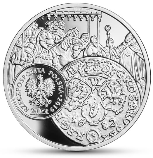Na awersie wpisana mniejsza współczesna moneta z orłem w koronie ustanowionym dla godła Rzeczypospolitej Polskiej. W otoku monety napis dużymi literami: Rzeczpospolita Polska, rok emisji monety 2019 oraz u dołu monety jej nominał 20 zł. Po prawej stronie rewers historycznego szóstaka, u góry zaś monety przy jej rancie fragment płaskorzeźby z pałacu w Wilanowie przestawiającej Jana III Sobieskiego na koniu tuż przed koronacją królewską