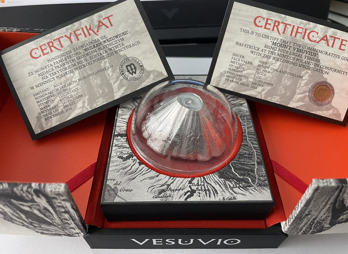 30 dolarów Wulkan Wezuwiusz 2016 r. - srebrna moneta kolekcjonerska 30 dolarów nowozelandzkich, producent Mennica Polska S.A. moneta bita stemplem lustrzanym w kapslu ochronnym oraz pudełko z dwom certyfikatami w języku polskim i języku angielskim, stan zachowania menniczy