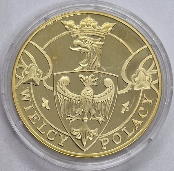 Marszałek Józef Piłsudski 1867-1935 z serii Wielcy Polacy, numizmat z mosiądzu platerowany 24-karatowym złotem. Stempel lustrzany, numizmat w kapslu ochronnym, stan zachowania menniczy