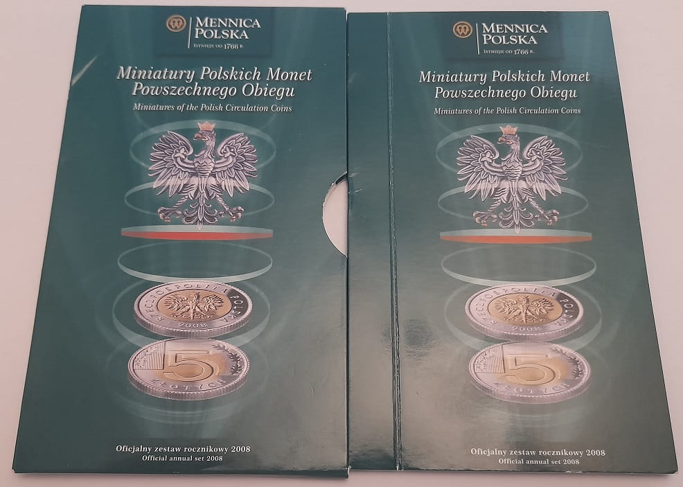 Zestaw wszystkich nominałów polskich monet obiegowych w pomniejszeniu. Spełniają wszystkie normy by być także środkiem płatniczym. Posiadają orła ze znakiem mennicy: m/w
